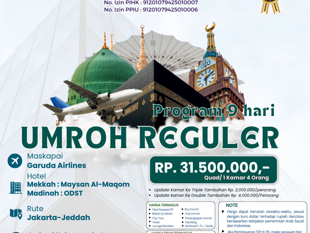 - Perlengkapan : Koper kabin, koper bagasi, tas paspor, kain ihram/mukena, sandal, buku manasik, kain seragam, syal, & sabuk