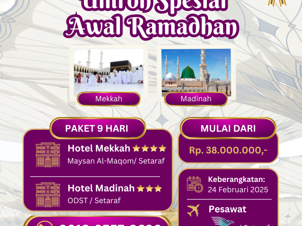 Pendaftaran & Persyaratan Umroh Tanpa Batasan Usia, kecuali: Jamaah dengan kondisi sakit kronis atau usia lanjut/renta wajib didampingi keluarga atau pendamping yang sehat. Jamaah wanita hamil yang memiliki kondisi kehamilan sensitif, serta jamaah dengan alat bantu khusus (seperti kursi roda, tabung oksigen pribadi, dll), wajib menyertakan keterangan medis dan mengikuti prosedur sesuai kebijakan maskapai dan otoritas Arab Saudi. Paspor Asli (Hijau): Nama terdiri dari minimal 2 suku kata (disarankan 3 suku kata). Masa berlaku minimal 7 bulan sebelum tanggal keberangkatan. Pas Foto Berwarna: Ukuran 4×6 cm, latar belakang putih, fokus wajah 80%. Jumlah: 6 lembar. Khusus wanita: menggunakan jilbab. Fotokopi KTP: 1 lembar, jelas dan terbaca. Kartu Kuning (Buku Vaksin Meningitis): Diterbitkan oleh Kantor Kesehatan Pelabuhan (KKP) atau instansi resmi yang ditunjuk. Disarankan vaksin minimal 2 minggu sebelum keberangkatan. Formulir Pendaftaran & Manasik: Mengisi dan menandatangani formulir pendaftaran resmi yang disediakan pihak travel. Wajib mengikuti manasik sebelum keberangkatan (jadwal akan diinformasikan). Pembayaran Resmi: Semua pembayaran hanya sah jika ditransfer ke Rekening Resmi atas nama PT Aminin Travel Indonesia Bukti transfer wajib dikonfirmasi ke admin resmi.