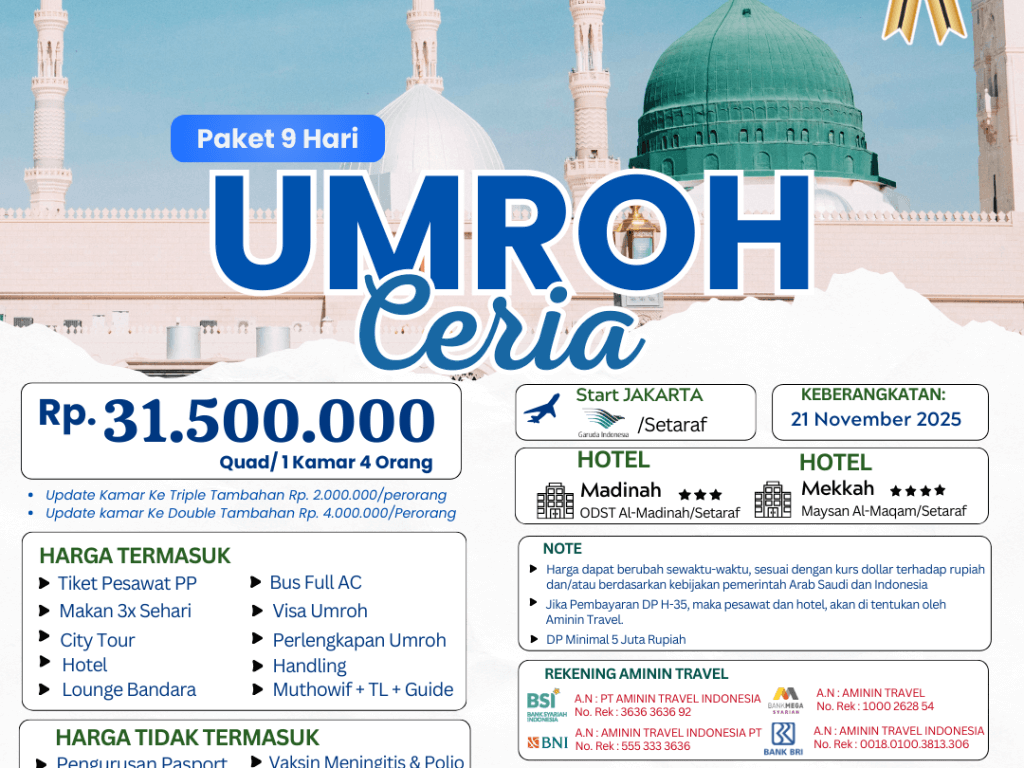 - Perlengkapan : Koper kabin, koper bagasi, tas paspor, kain ihram/mukena, sandal, buku manasik, kain seragam, syal, & sabuk