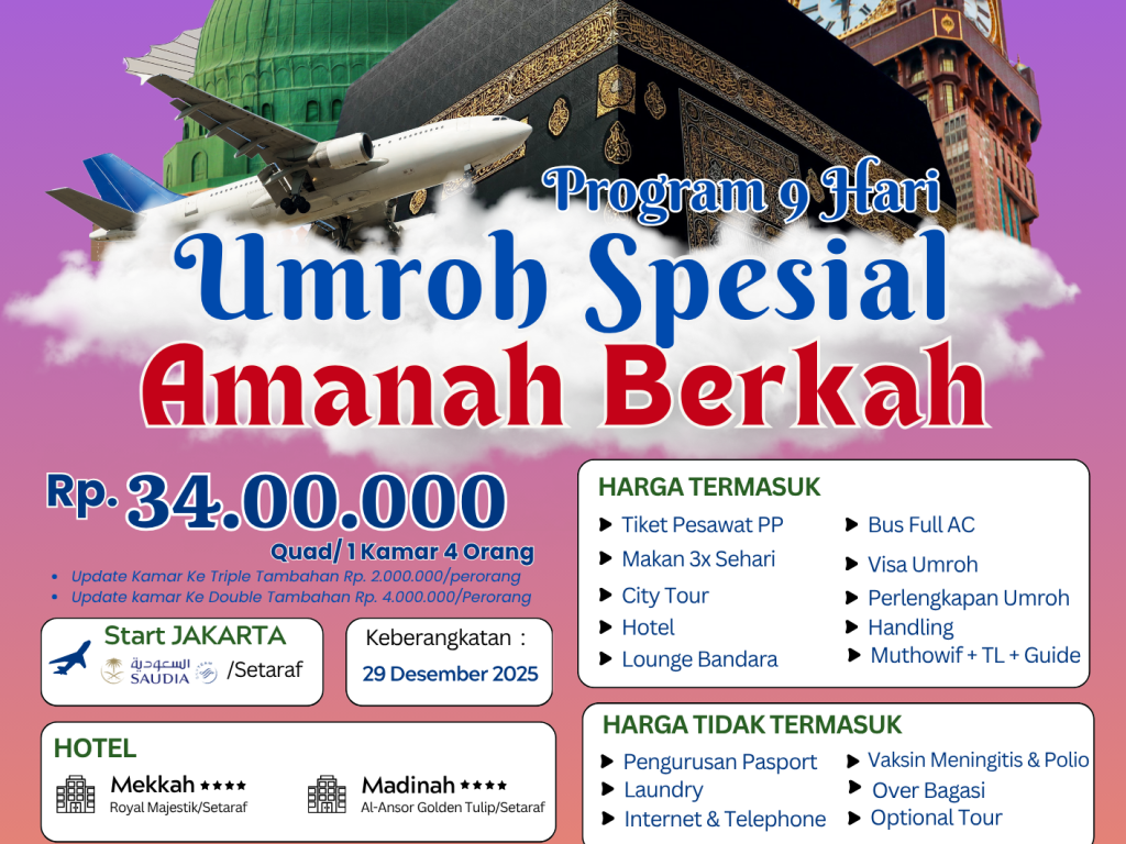 - Tiket penerbangan Jakarta-Saudi PP kelas Ekonomi Visa umrah Akomodasi & transportasi sesuai program Perlengkapan : Koper kabin, koper bagasi, tas paspor, kain ihram/mukena, sandal, buku mana