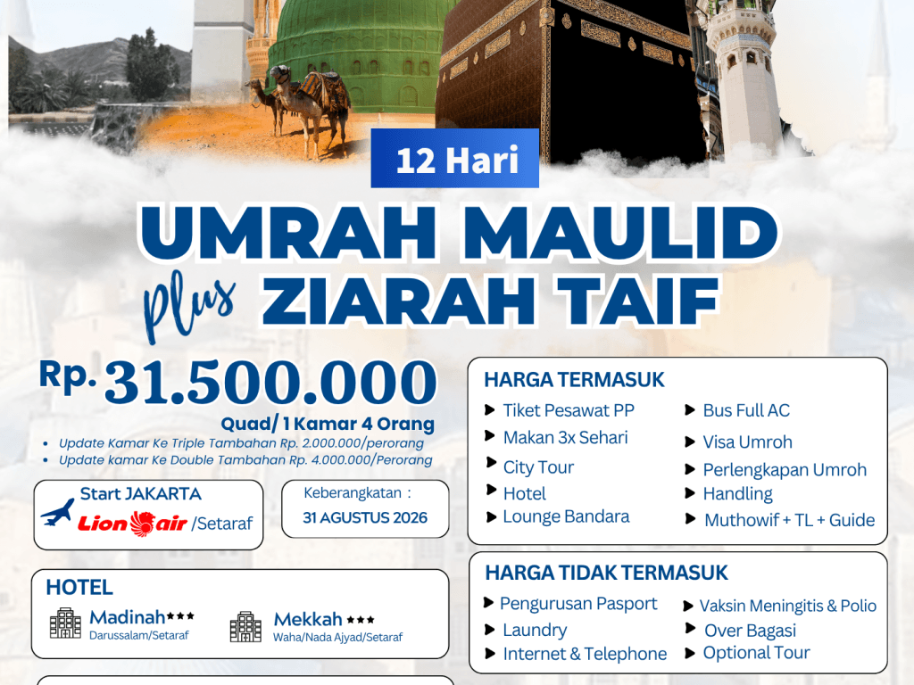 - Perlengkapan : Koper kabin, koper bagasi, tas paspor, kain ihram/mukena, sandal, buku manasik, kain seragam, syal, & sabuk